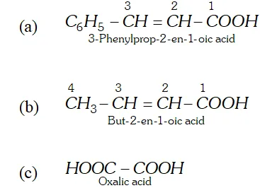 Q. Write the structure and give the IUPAC names of the following compounds. (a) Cinnamic acid (b) Crotonic acid (c) Oxalic acid.