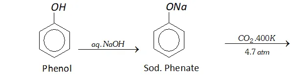 $\mathrm{CO}_{2}$ under high pressure of $4-7$ atm, at about $400 \mathrm{K}$ to form salicylic acid.
