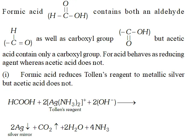 Q. Formic acid reduces Tollen’s reagent while other carboxylic acids do not. Justify.