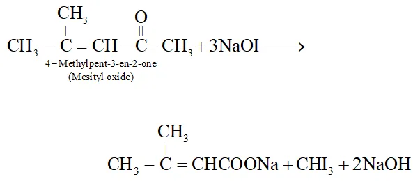 Q. Suggest a suitable oxidising agent for the conversion $\left(\mathrm{CH}_{3}\right)_{2} \mathrm{C}=\mathrm{CHCOCH}_{3} \rightarrow\left(\mathrm{CH}_{3}\right)_{2} \mathrm{C}=\mathrm{CHCO}_{2} \mathrm{H}$