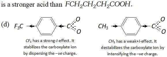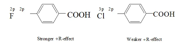 Thus, in $p$ -fluorobenzoic acid, $+R$ -effect outweighs the $-I-$ effect but is p-chlorobenzoic acid, it is the I-effect which outweighs the $+$ R-effect. Consequently acid is a weaker acid than p-chlorobenzoic acid.