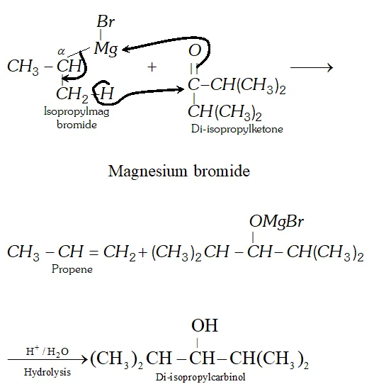 M.P.V. reduction. For example, when isopropylmagnesium bromide is added to di-isopropyl ketone, the expected $3^{\circ}$ alcohol (i.e., tri-isopropylcarbinol) is not formed; instead the secondary alcohol, di-isopropylcarbinol is obtained by reduction of the keto group.