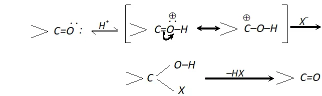 produces $H^{+}$ easily for protonation of group of aldehyde or ketone.