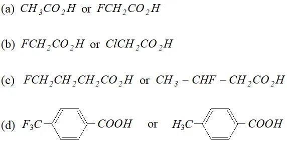 (ii) nature of atom/group attached (iii) position of substituent on the chain. Hence, $\left(\mathrm{CH}_{3}\right)_{2} \mathrm{CHCOOH}<\mathrm{CH}_{3} \mathrm{CH}_{2} \mathrm{CH}_{2} \mathrm{COOH}$
