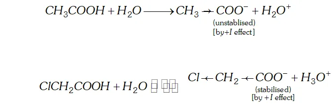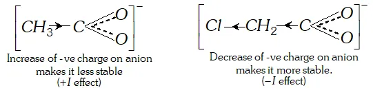 Ans. (i) Chloroacetic acid is a stronger acid than acetic acid and has higher value of dissociation constant $K a$ than that of acetic acid. We know that $p K a=-\log K a,$ it means that chloroacetic acid having higher value $K a$ will have lower value of $p K a .$ Chloroacetic acid is stronger than acetic acid because $C l$ group is electron withdrawing and chloroacetate ion is more stabilised than acetate ion (as methyl group is electron releasing).