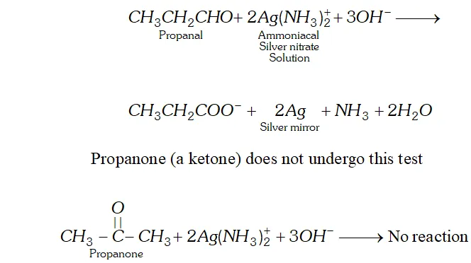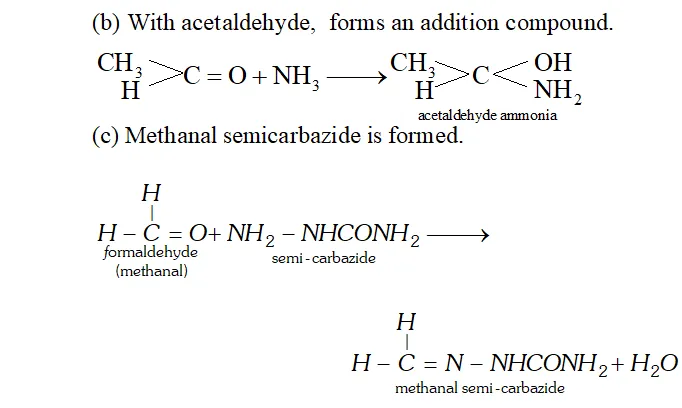 (i) Schiff's base : Schiff's reagent is an aqueous solution of magenta or pink coloured rosaniline hydrochloride which has been decolourised by passing $\mathrm{SO}_{2}$ when aldehyde are treated with decolourised solution of schiff's reagent, its pink or magenta colour is restored. This reaction is used as a test for aldehyde because ketones do not restore the pink colour of schiff reagent.
