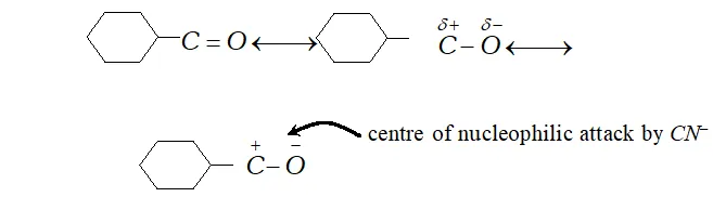group $\left(>C^{\delta+}=O^{\delta-}\right)$ takes place easily. centre of nucleophilic attack by $C N^{-}$