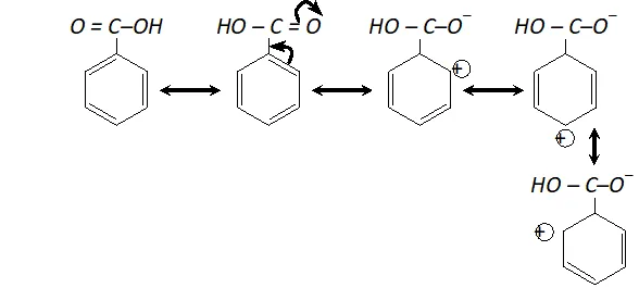 (ii) Carboxyl group (-COOH) is electron withdrawing i.e. deactivating the benzene ring and thus electron density becomes very less at ortho and para position in comparison to meta position. Electrophiles (+vely charged species) find it easier to attack at meta position as there is higher electron density thus $-C O O H$ group is meta directing.
