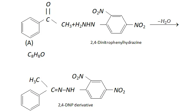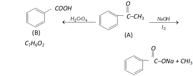 Q. An organic compound (A) with molecular formula $\mathrm{C}_{8} \mathrm{H}_{8} \mathrm{O}$ forms an orange-red precipitate with $2,4$ -DNP reagent and gives yellow precipitate on heating with iodine in the presence of sodium hydroxide. It neither reduces Tollen's or Fehlings' reagent, nor does it decolourise bromine water or Baeyer's reagent. On drastic oxidation with chromic acid, it gives a carboxylic acid (B) having molecular formula $C_{7} H_{6} O_{2} .$ Identify the compounds $(\mathrm{A})$ and $(\mathrm{B})$ and explain the reactions involved.