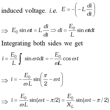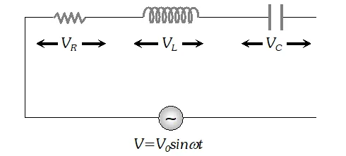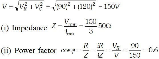 The voltage across resistance R is given by $V_{R}=i R$ it is in phase with current and it is denoted by vector $\overrightarrow{\mathrm{OA}}$ (ii) The voltage across inductor L is given by $V_{L}=i X_{L}$ it leads the current by $90^{\circ}$and it is represented by vector $\overrightarrow{O B}$ along Y (iii) The voltage across capacitor C is given by (iii) The voltage across capacitor C is given by it lag behind the current by 90°, and it is represented by along it lag behind the current by $90^{\circ}$, and it is represented by $\overrightarrow{O C}$ along $Y^{\prime}$