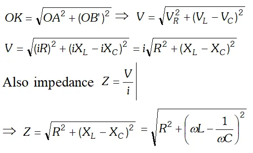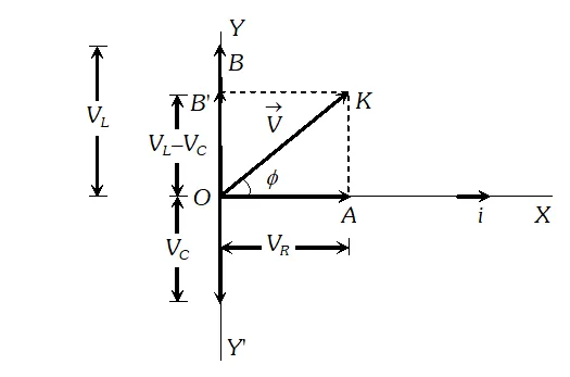 As the voltage across $L$ and $C$ have phase difference by $180^{\circ}$ the voltage across $L C .$ Combination is $\left(V_{L}-V_{c}\right),$ assuming that $V_{L}>V_{C}$ It is represented by vector $O B$ in phasor diagram the resultant of $\frac{1}{O A}$ and $\overline{O B}$ is along $\overline{O K}$ hence from phasor diagram it is clear that $|$