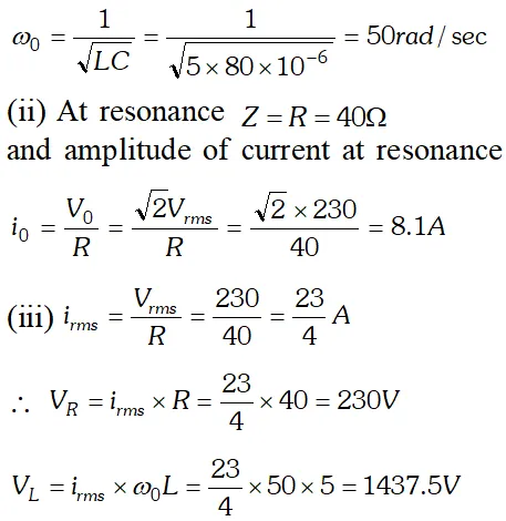 In resonance $V_{C}=V_{L}=1437.5 \mathrm{V}$ The algebraic sum of the three voltages is more than the source voltage of 230 V. These voltages are not in the same phase and cannot be added like ordinary numbers. The voltage across L and C are out of phase and get added to zero. So $\left(V_{R}\right)_{m s}=$ applied rms voltage.