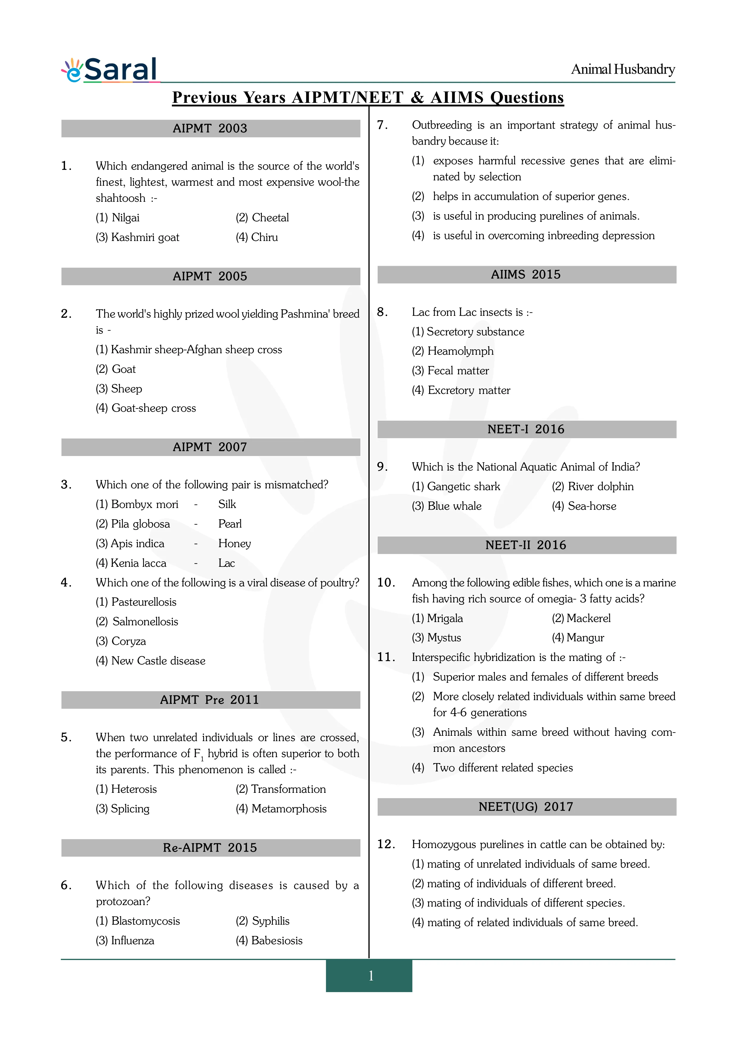 Here you will get Complete Animal Husbandry NEET Previous Year Questions with complete and detailed solutions.