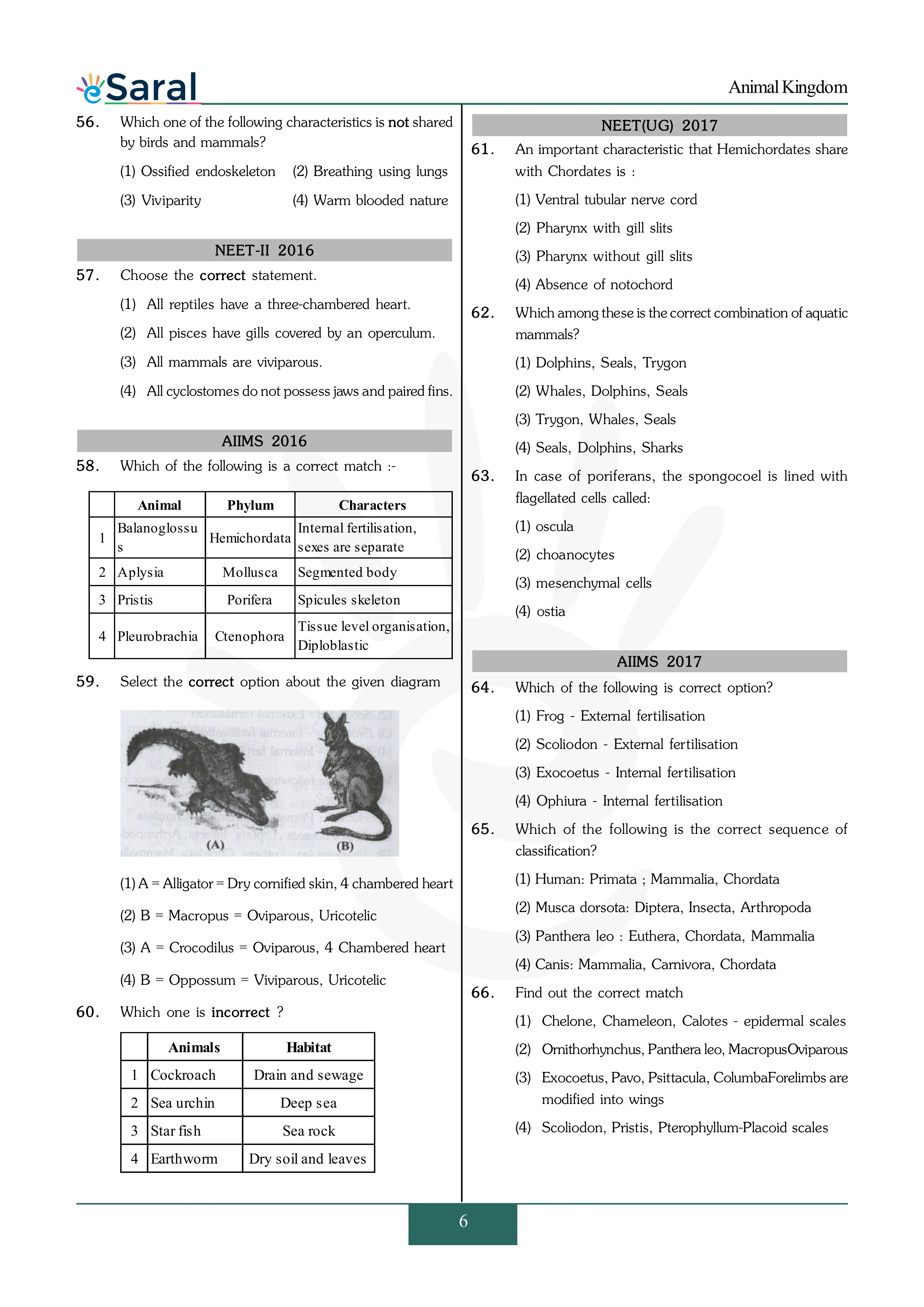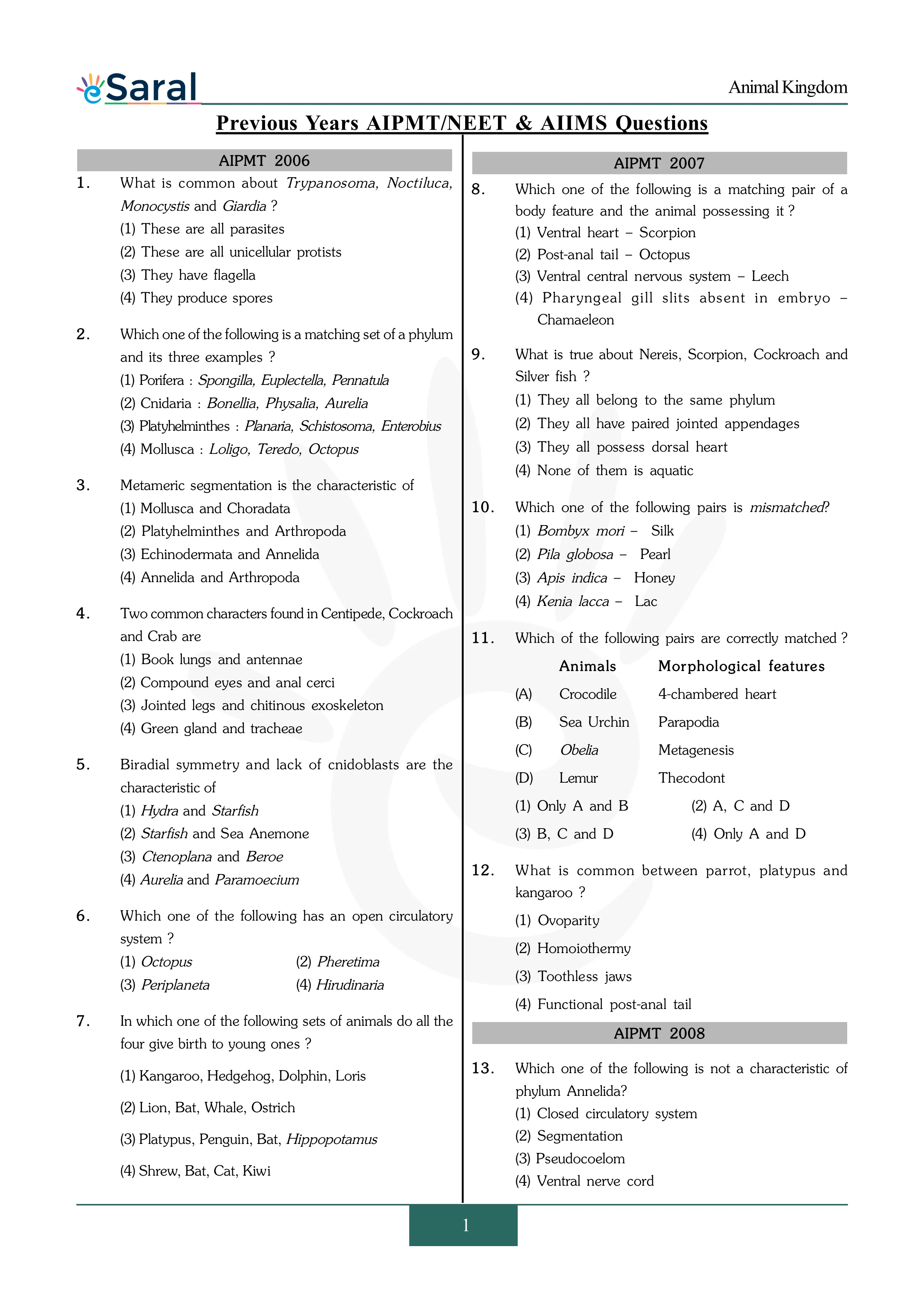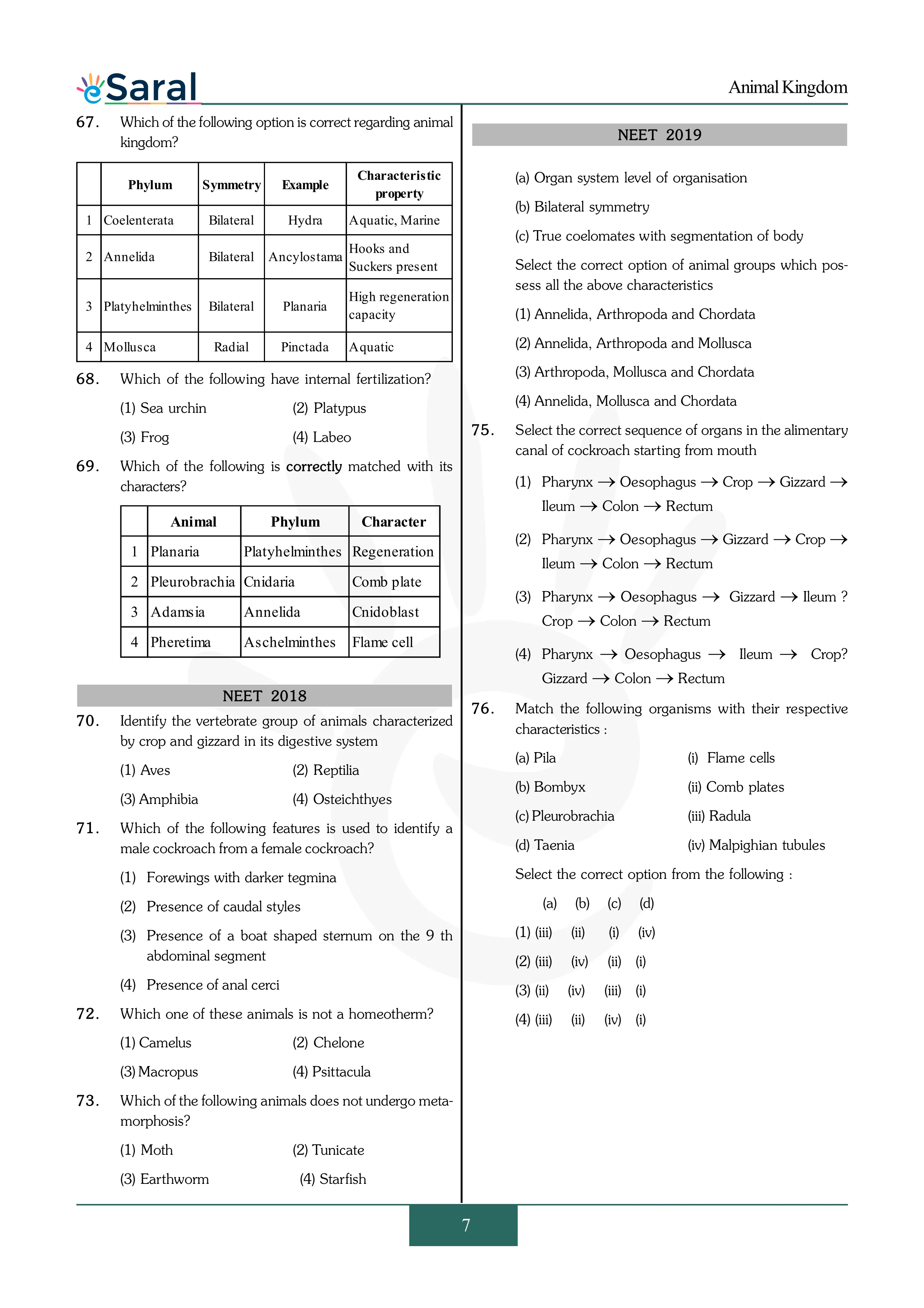 Animal Kingdom - NEET Previous Year Questions with Complete Solutions