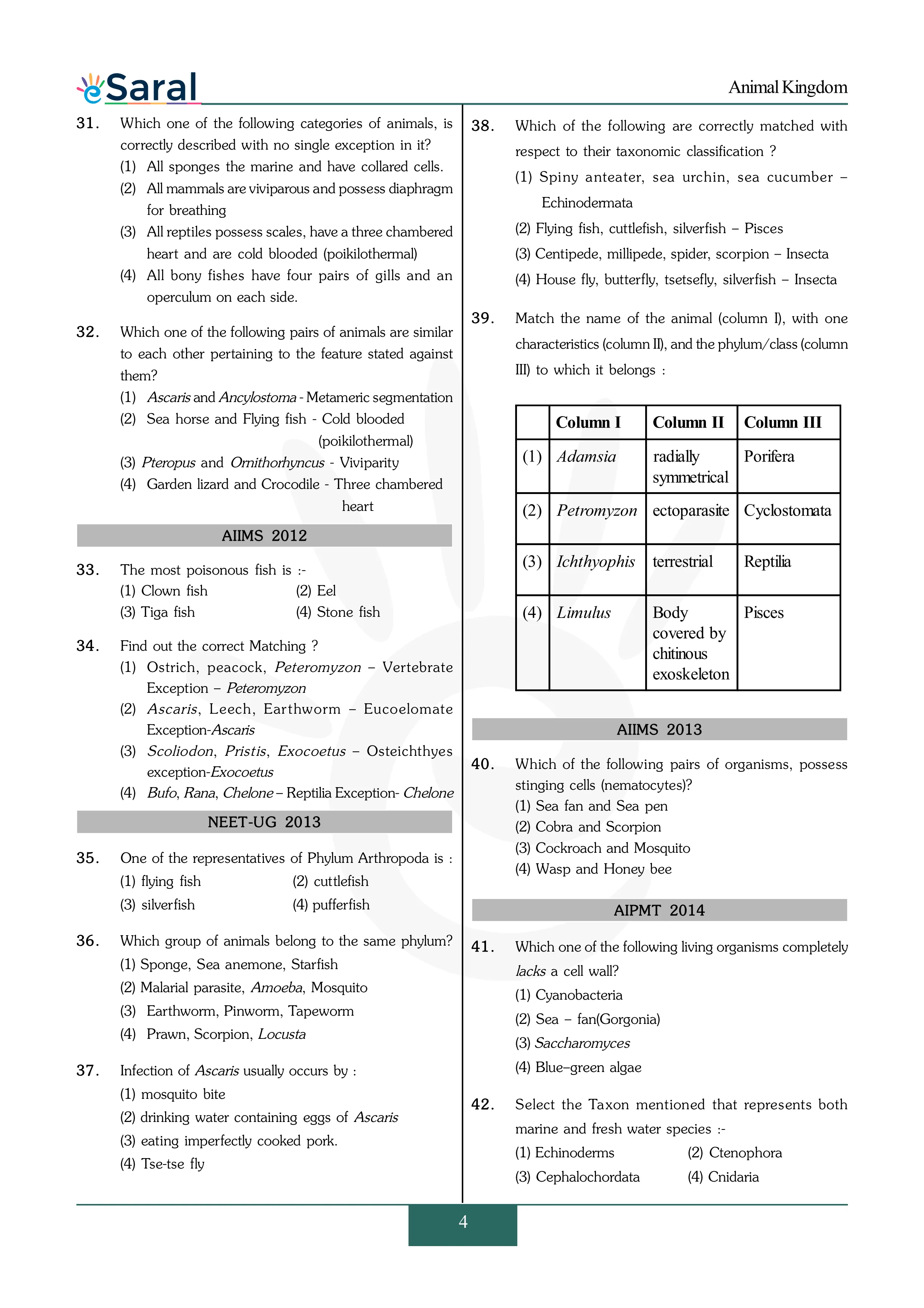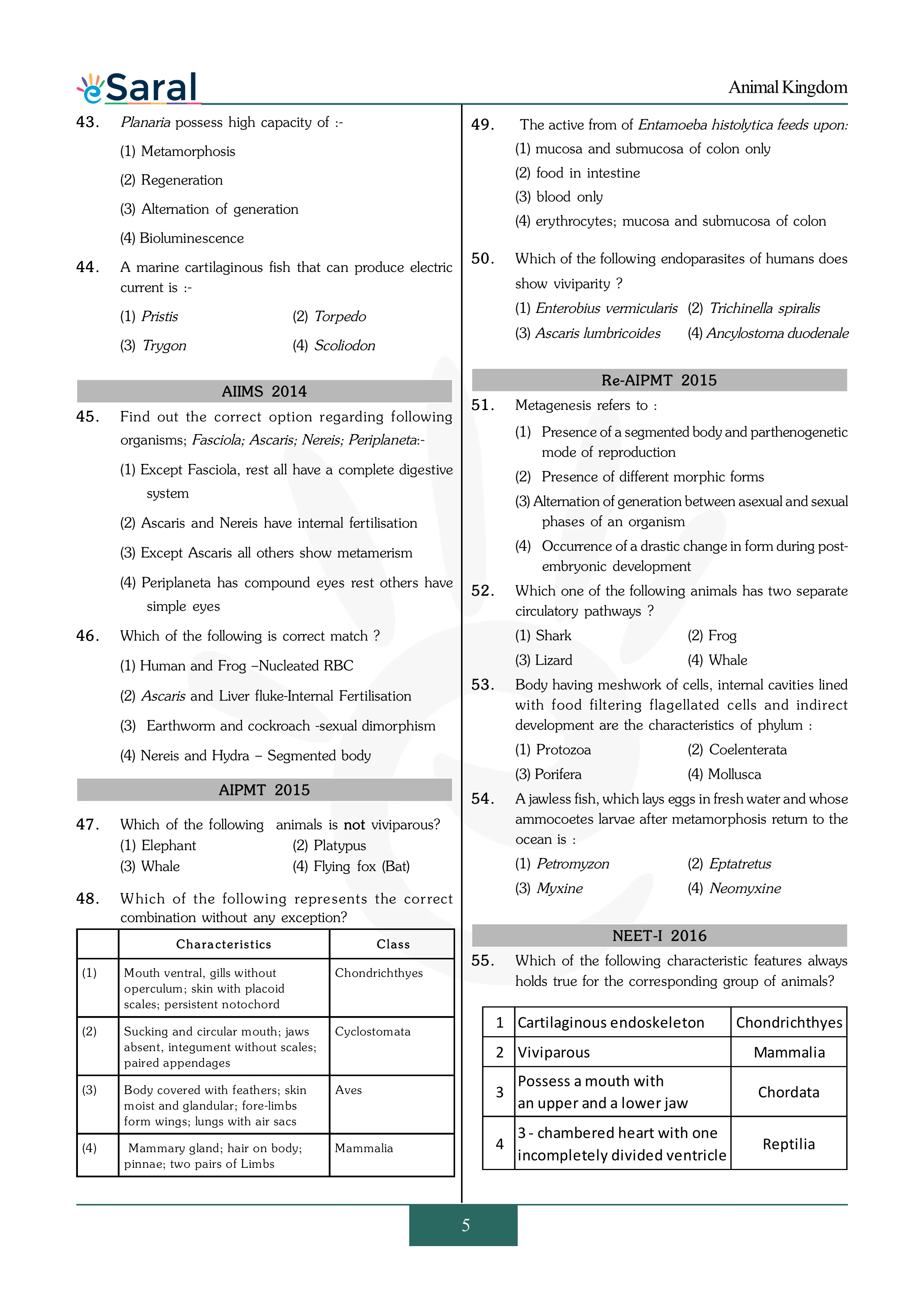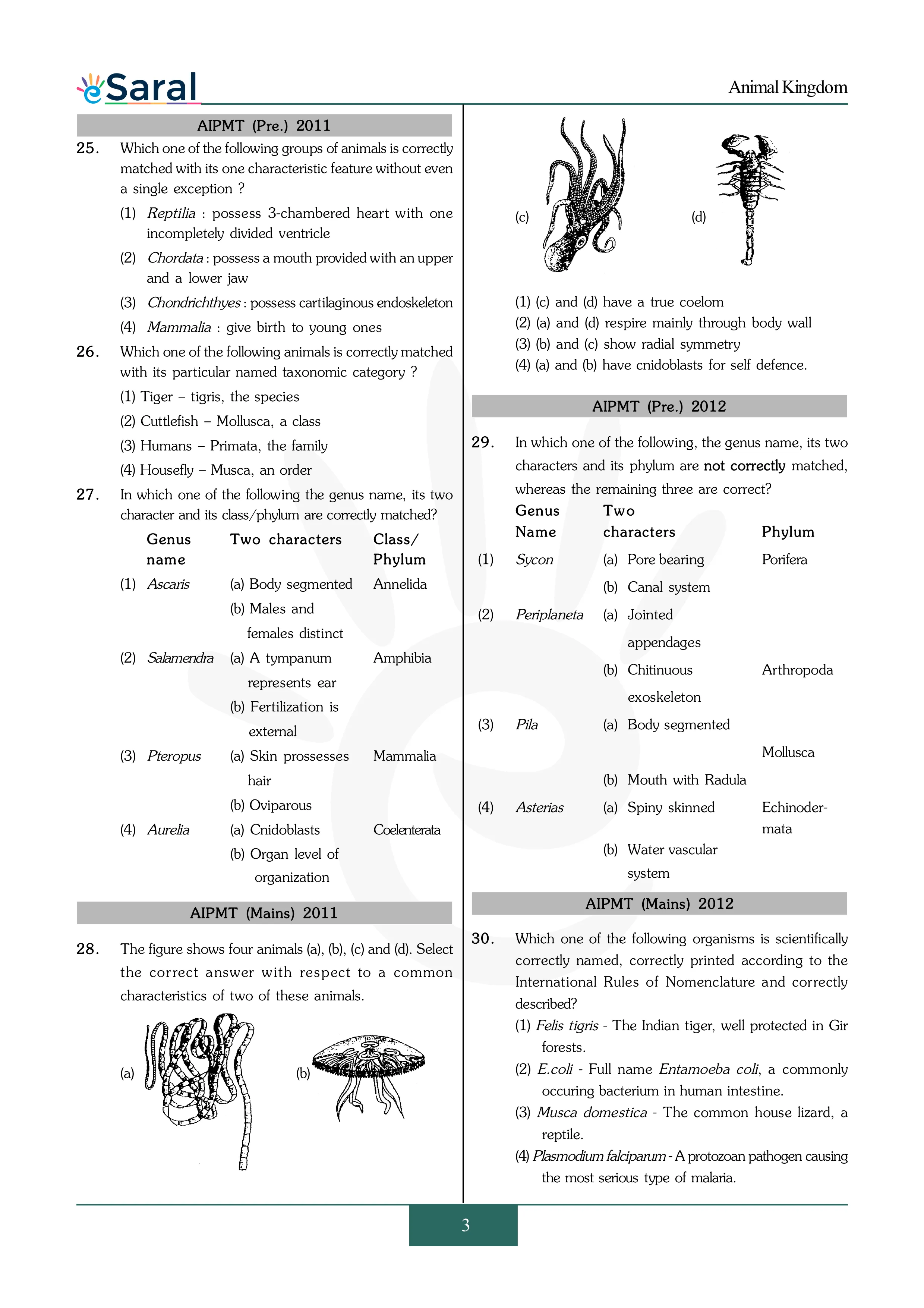 Animal Kingdom - NEET Previous Year Questions with Complete Solutions