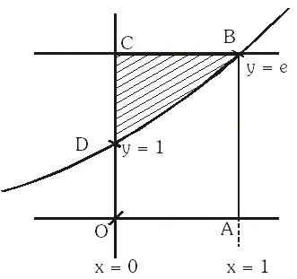 Q. Area of the region bounded by the curve $y=e^{x}$ and $\operatorname{lines} x=0$ and $y=e$ is