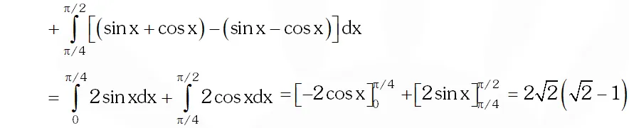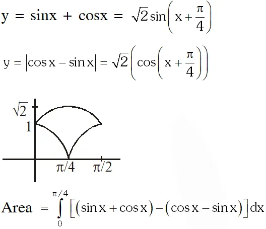 Q. The area enclosed by the curve $y=\sin x+\cos x$ and $y=|\cos x-\sin x|$ over the interval $\left[0, \frac{\pi}{2}\right]$ is