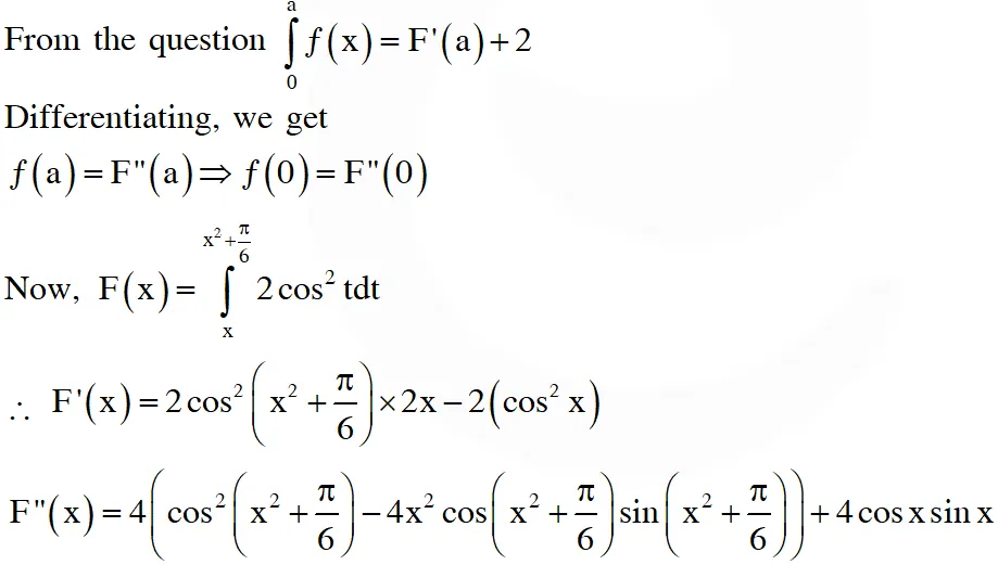 Q. Let $\mathrm{F}(\mathrm{x})$$=\int_{x}^{x^{2}+\frac{\pi}{6}}$ $2 \cos ^{2}$ tdt for all $\mathrm{x} \in \mathbb{U}$ and $f:\left[0, \frac{1}{2}\right] \rightarrow[0, \infty)$ be a continuous function. For $\mathrm{a} \in\left[0, \frac{1}{2}\right],$ if $\mathrm{F}^{\prime}(\mathrm{a})+2$ is the area of the region bounded by x = 0, y = 0, y = ƒ(x) and x = a, then ƒ(0) is