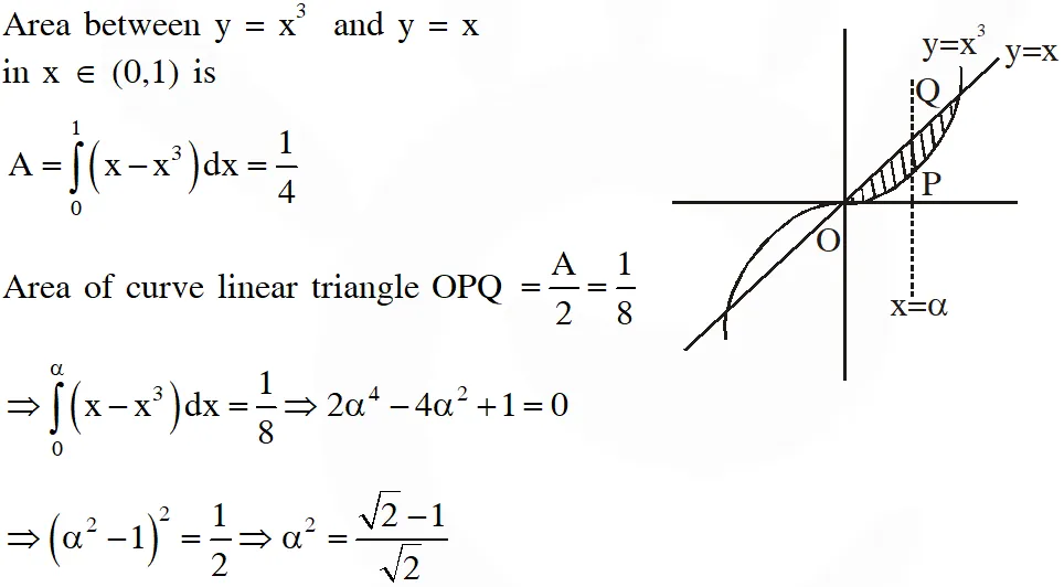 Q. If the line $x=\alpha$ divides the area of region $R=\left\{(x, y) \in \square^{2}: x^{3} \leq y \leq x, 0 \leq x \leq 1\right\}$ into two equal parts, then