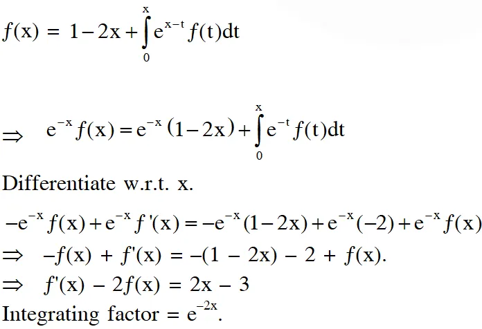 Q. Let $f:[0, \infty) \rightarrow \square$ be a continuous function such that $f(\mathrm{x})=1-2 \mathrm{x}+\int_{0}^{\mathrm{x}} \mathrm{e}^{\mathrm{x}-\mathrm{t}} f(\mathrm{t}) \mathrm{d} \mathrm{t}$ for all $\mathrm{x} \in[0, \infty) .$ Then, which of the following statement(s) is (are) TRUE?