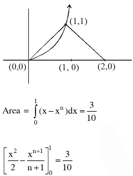 Q. A farmer $F_{1}$ has a land in the shape of a triangle with vertices at $P(0,0), Q(1,1)$ and $R(2,)$ 0 . From this land, a neighbouring farmer $F_{2}$ takes away the region which lies between the side $P Q$ and a curve of the form $y=x^{n}(n>1) .$ If the area of the region taken away by the farmer $F_{2}$ is exactly $30 \%$ of the area of $\triangle P Q R,$ then the value of $n$ is