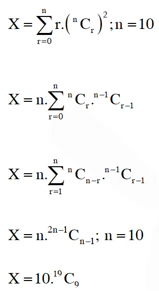 Q. Let $\mathrm{X}=\left(^{10} \mathrm{C}_{1}\right)^{2}+2\left(^{10} \mathrm{C}_{2}\right)^{2}+3\left(^{10} \mathrm{C}_{3}\right)^{2}+\ldots+10\left(^{10} \mathrm{C}_{10}\right)^{2},$ where $^{10} \mathrm{C}_{\mathrm{r}^{\prime}}, \mathrm{r} \in\{1,2, \ldots, 10\}$ denote binomial coefficients. Then, the value of $\frac{1}{1430} \mathrm{X}$ is