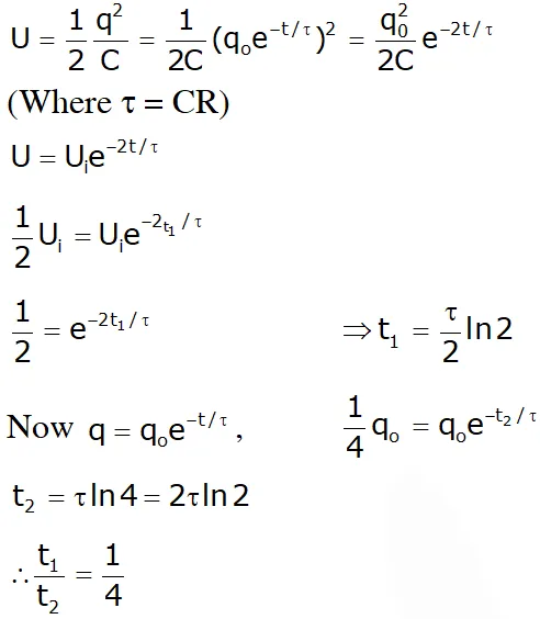 Q. Let C be the capacitance of a capacitor discharging through a resistor R. Suppose $t_{1}$ is the time taken for the energy stored in the capacitor to reduce to half its initial value and $t_{2}$ is the time taken for the charge to reduce to one-fourth its initial value. Then the ratio $t_{1} / t_{2}$ will be