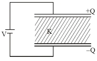 Q. A parallel plate capacitor of capacitance 90 pF is connected to a battery of emf 20V. If a dielectric material of dielectric constant $\mathrm{K}=\frac{5}{3}$ is inserted between the plates, the magnitude of the induced charge will be :-