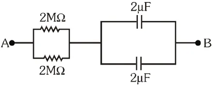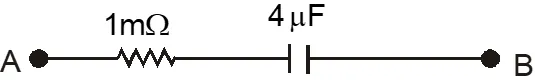 Q. At time t = 0, a battery of 10V is connected across points A and B in the given circuit. If the capacitors have no charge initially, at what time (in seconds) does the voltage across them become 4V?