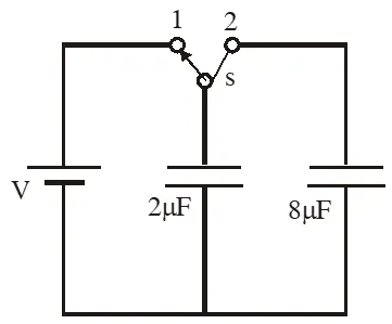 Q. A 2 $\mu \mathrm{F}$ capacitor is charged as shown in figure. The percentage of its stored energy dissipated after the switch S is turned to position 2 is