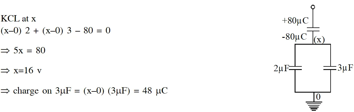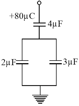Q. In the given circuit, a charge of $+80 \mu C$ is given to the upper plate of the $4 \mu \mathrm{F}$ capacitor. Then in the steady state, the charge on the upper plate of the $3 \mu \mathrm{F}$ capacitor is -