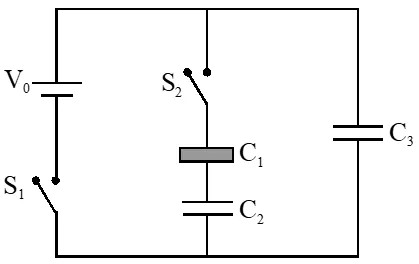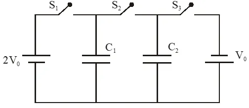 Q. In the circuit shown in the figure, there are two parallel plate capacitors each of the capacitance C. The switch $\mathrm{S}_{1}$ is pressed first to fully charge the capacitor $\mathrm{C}_{1}$ and then released. The switch $\mathrm{S}_{2}$ is then pressed to charge the capacitor $\mathrm{C}_{2}$. After some time, $\mathrm{S}_{2}$ is released and then $\mathrm{S}_{3}$ is pressed, After some time,