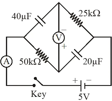 At $\mathrm{t} \rightarrow \infty,$ capacitor acts as open circuit $\&$ no current flows through voltmeter.