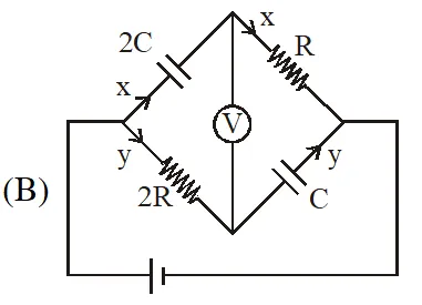 (D) After long time no current flows since both capacitor & voltmeter does not allow.