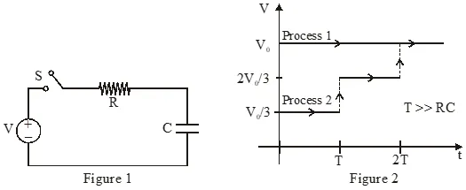 Process 2 : In a different process the voltage is first set to $\frac{\mathrm{v}_{0}}{3}$ and maintained for a charging time T >> RC. Then the voltage is raised to $\frac{2 v_{0}}{3}$ without discharging the capacitor and again maintained for a time T >> RC. The process is repeated one more time by raising the voltage to $\mathrm{V}_{0}$ and the capacitor is charged to the same final voltage $\mathrm{V}_{0}$ as in Process 1.