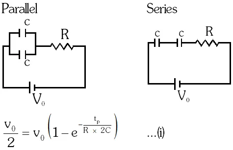 Q. Combination of two identical capacitors, a resistor R and a dc voltage source of voltage 6V is used in an experiment on (C–R) circuit. It is found that for a parallel combination of the capacitor the time in which the voltage of the fully charged combination reduces to half its original voltage is 10 second. For series combination the time needed for reducing the voltage of the fully charged series combination by half is :- (1) 20 second (2) 10 second (3) 5 second (4) 2.5 second [AIEEE-2011]