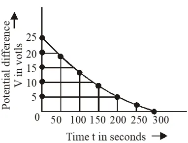 (1) 100 sec and 150 sec (2) 150 sec and 200 sec (3) 0 and 50 sec (4) 50 sec and 100 sec [AIEEE-2012] Ans. (1) $\mathrm{t}=0.37 \% \mathrm{of} \mathrm{V}_{0}$ $=0.37 \times 25=9.25$ volt where is in between 100 and 150 sec.