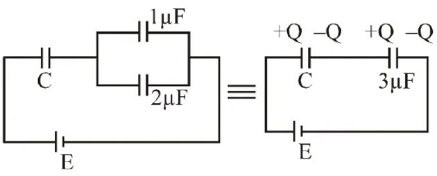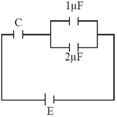 $\mathrm{C}_{\mathrm{eq}}=\frac{3 \mathrm{C}}{3+\mathrm{C}} \quad \mathrm{Q}=\mathrm{Ceq} \mathrm{E}$ $\mathrm{Q}_{2}=\frac{2 \mathrm{CE}}{(\mathrm{C}+3)}=\frac{3 \mathrm{CE}}{(\mathrm{C}+3)}$ $=2 \mathrm{E}\left[1-\frac{3}{\mathrm{C}+3}\right]$ $\mathrm{Q}_{2 / \mathrm{when}} \mathrm{C}=1_{\mathrm{HF}}=2 \mathrm{E}\left[\frac{1}{4}\right]=\frac{\mathrm{E}}{2}$ $\mathrm{Q}_{2 / \mathrm{when}} \mathrm{C}=3_{1 \mathrm{F}}=2 \mathrm{E}\left[\frac{1}{2}\right]=\mathrm{E}$ $\frac{\mathrm{dQ}}{\mathrm{d} \mathrm{C}}=-\frac{2 \mathrm{E} \cdot 3}{(\mathrm{C}+3)}(-1)=\frac{6 \mathrm{E}}{(\mathrm{C}+3)^{2}}>0$ $\frac{\mathrm{d}^{2} \theta}{\mathrm{d} \mathrm{C}^{2}}=\frac{6 \mathrm{E}(-2)}{(\mathrm{C}+3)^{3}}=-\frac{12 \mathrm{E}}{(\mathrm{C}+3)^{2}}<0$ Q. A combination of capacitors is set up as shown in the figure. The magnitude of the electric field, due to a point charge Q (having a charge equal to the sum of the charges on the $4 \mu \mathrm{F}$ and $9 \mu \mathrm{F}$capacitors), at a point 30 m from it , would equal: