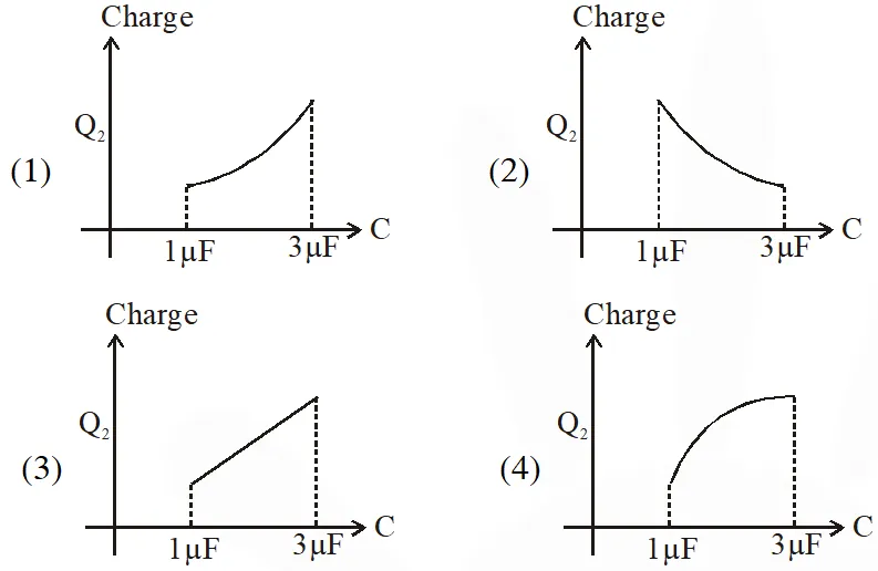 Q. In the given circuit, charge $\mathrm{Q}_{2}$ on the 2µF capacitor changes as C is varied from $1 \mu \mathrm{F}$ to $3 \mu \mathrm{F} \cdot \mathrm{Q}_{2}$ as a function of 'C' is given properly by : (figures are drawn schematically and are not to scale) :-