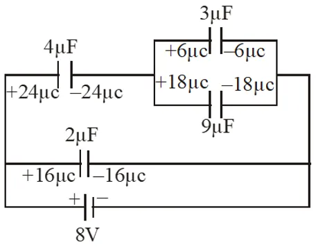 $\Rightarrow$ Minimum no. of capacitors $=8 \times 4=32$ Q. A parallel plate capacitor of capacitance 90 pF is connected to a battery of emf 20V. If a dielectric material of dielectric constant $\mathrm{K}=\frac{5}{3}$ is inserted between the plates, the magnitude of the induced charge will be :- (1) 0.3 n C (2) 2.4 n C (3) 0.9 n C (4) 1.2 n C [JEE-Mains-2018]