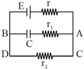 $\mathrm{Q}=24+18=42 \mu \mathrm{c}$ $\mathrm{E}=\frac{\mathrm{KQ}}{\mathrm{r}^{2}}$ $\Rightarrow \mathrm{E}=\frac{9 \times 10^{9} \times 42 \times 10^{-6}}{(30)^{2}}=420 \mathrm{N} / \mathrm{C}$ Q. In the given circuit diagram when the current reaches steady state in the circuit, the charge on the capacitor of capacitance C will be : (1) $\mathrm{CE} \frac{\mathrm{r}_{2}}{\left(\mathrm{r}+\mathrm{r}_{2}\right)}$ (2) $\mathrm{CE} \frac{\mathrm{r}_{1}}{\left(\mathrm{r}_{1}+\mathrm{r}\right)}$ (3) CE (4) $\mathrm{CE} \frac{\mathrm{r}_{1}}{\left(\mathrm{r}_{2}+\mathrm{r}\right)}$ [JEE-Mains-2017]