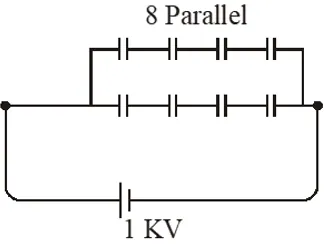 To hold 1 KV potential differenceminimum four capacitors are required in series $\Rightarrow \quad \mathrm{C}_{1}=\frac{1}{4}$ for one series. So for $\mathrm{Ceq}$ to be $2 \mu \mathrm{F}, 8$ parallel combinations are required.