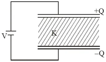 Q. A parallel plate capacitor is made of two circular plates separated by a distance of 5 mm and with a dielectriic of dielectric constant 2.2 between them. When the electric field in the dielectric field in the dielectric is $3 \times 10^{4}$ V/m, the charge density of the positive plate will be close to : (1) $3 \times 10^{4} \mathrm{C} / \mathrm{m}^{2}$ (2) $6 \times 10^{4} \mathrm{C} / \mathrm{m}^{2}$ (3) $6 \times 10^{-7} \mathrm{C} / \mathrm{m}^{2}$ (4) $3 \times 10^{-7} \mathrm{C} / \mathrm{m}^{2}$ [JEE-Mains-2014]