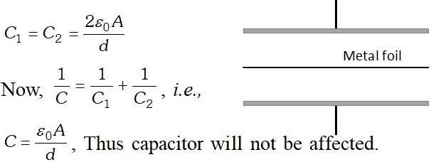 Q. What will be the new capacitance of a capacitor in which a metal foil of negligible thickness is introduced between the plates.