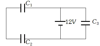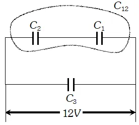 Clearly $C_{3}$ is in parallel to $12 V$ source. $\Rightarrow V_{3}=12 V$ and $Q_{3}=C_{3} V=6 \times 12=72 \mu C$ i.e., $Q_{3}=72 \mu C$ Now, $C_{12}=3 \mu F$ $\Rightarrow Q_{12}=C_{12} \times V=36 \mu C$ Hence, $Q_{1}=Q_{2}=36 \mu C$