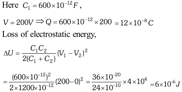 Q. A $600 p F$ capacitor is charged by a 200V supply. It is then disconnected from the supply and is connected to another uncharged capacitor. How much electrostatic energy is lost in the process? [NCERT]