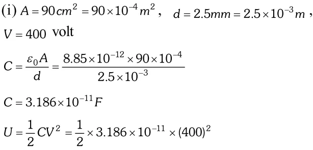 Q. The plates of a plate capacitor have an area of $90 \mathrm{cm}^{2}$ each and are separated by 2.5mm. The capacitor is charged by connecting it to a 400V supply : (i) How much electrostatic energy is stored by the capacitor? (ii) View this energy as stored in the electrostatic field between the plates, and obtain the energy per unit volume u. [NCERT]
