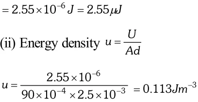 $E_{+}=\frac{\sigma}{2 \varepsilon_{0}}=\frac{Q}{2 A \varepsilon_{0}}$ at all points if the plate is large. The negative charge $-Q$ finds itself in the field of this positive charge. The force $-Q$ on is, therefore $\cdot F=-Q E$$=(-Q) \frac{Q}{2 A \varepsilon_{0}}=-\frac{Q^{2}}{2 A \varepsilon_{0}}$ The magnitude of the force is is $F=\frac{Q^{2}}{2 A \varepsilon_{0}}$ (ii) Work done in increasing the separation between the plates by a distance $d x$ against the force of attraction $F$ between the plates is $d W=F d x \cdots$ (i) As, energy density, $u=\frac{1}{2} \varepsilon_{0} E^{2}$ $\therefore$ Increase in potential energy m $=u A d x=\frac{1}{2} \varepsilon_{0} E^{2} A d x \ldots$ (ii) From the equation (i) and (ii)