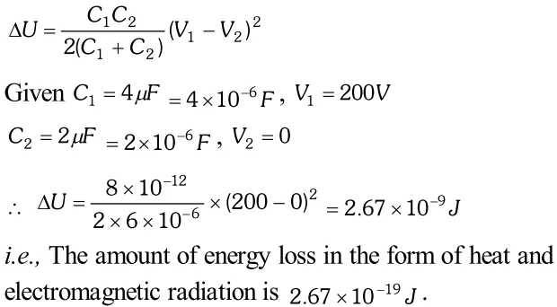 Q. A $4 \mu F$ capacitor is charged by a 200V supply. It is then disconnected from the supply, and is connected to another uncharged $2 \mu \mathrm{F}$ capacitor. How much electrostatic energy of the first capacitor is lost in the form of heat and electromagnetic radiation ? [NCERT]