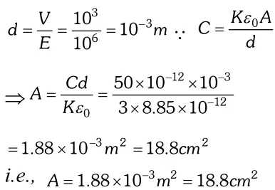 Q. A parallel plate capacitor is to be designed with a voltage rating $1 k V$, using a material of dielectric constant 3 and dielectric strength about $10^{7} \mathrm{Vm}^{-1}$ . (Dielectric strength is the maximum electric field a material can tolerate without breakdown, i.e., without starting to conduct electricity through partial ionisation) for safety, we should like the field never to exceed, say 10% of the dielectric strength. What minimum area of the plates is required to have a capacitance of $50 p F$ ? [NCERT]